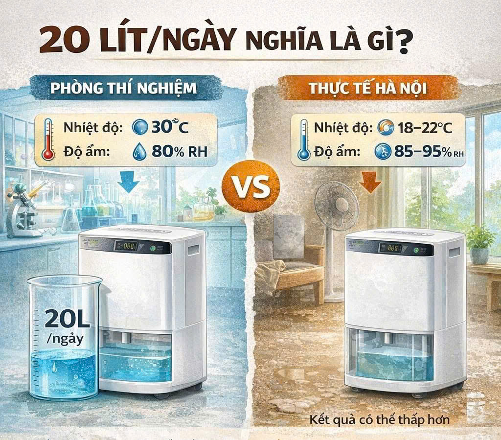 Thông số “20 lít/ngày” là công suất hút ẩm tối đa, được thử nghiệm trong điều kiện tiêu chuẩn: