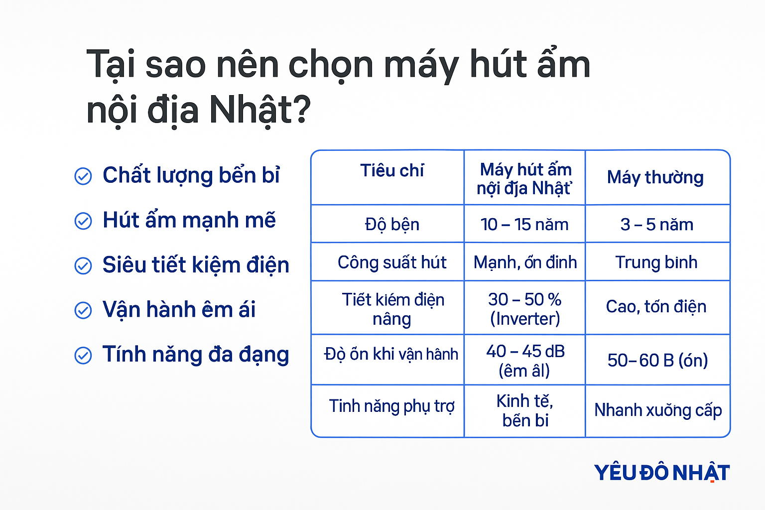 Máy hút ẩm nội địa Nhật có gì đặc biệt? Tìm hiểu lý do nên chọn mua: bền bỉ, tiết kiệm điện, hoạt động êm ái, tính năng đa dạng, thiết kế thông minh.